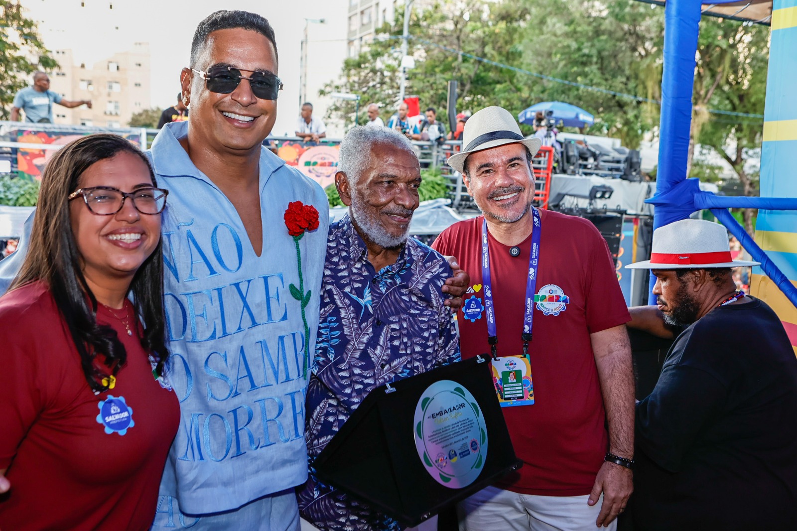 O cantor e compositor Nelson Rufino recebeu, durante a abertura oficial da folia, a placa de Embaixador do Carnaval Sustentável de Salvador 2026. A homenagem foi concedida pela Secretaria de Sustentabilidade, Resiliência, Bem-Estar e Proteção Animal (Secis), em reconhecimento à trajetória artística e à contribuição do artista para o samba, ritmo que é o grande homenageado da festa este ano.